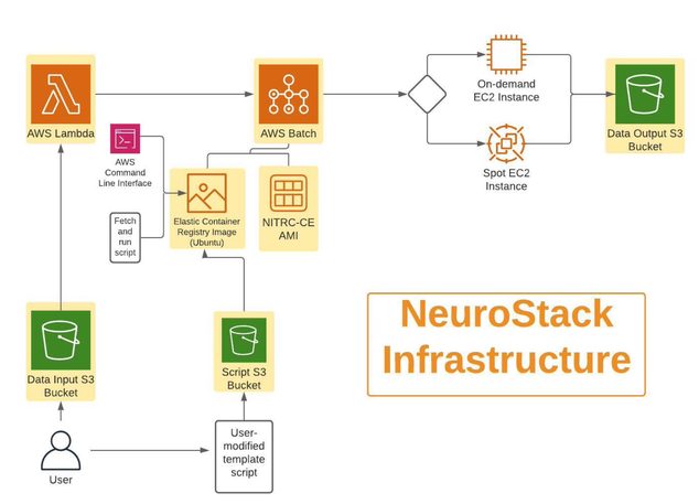 We are proud to present NeuroStack, built through a collaboration between researchers at the Yale School of Medicine and the University of Massachusetts Medical School. NeuroStack is a tool to aid researchers working with neuroimaging data using AWS cloud computing. Little to no AWS experience is needed to use NeuroStack, and it is freely available to the research community on the NITRC website. When you download NeuroStack, you build a pipeline of AWS resources optimized for neuroimaging workflows into your AWS account. Researchers who previously would have needed to spend hours learning about and building AWS services from scratch can now use NeuroStack to immediately begin working with their data. To use NeuroStack, simply modify and upload a template script to fit your needs and upload your data. Your uploaded data will immediately begin processing according to your script.