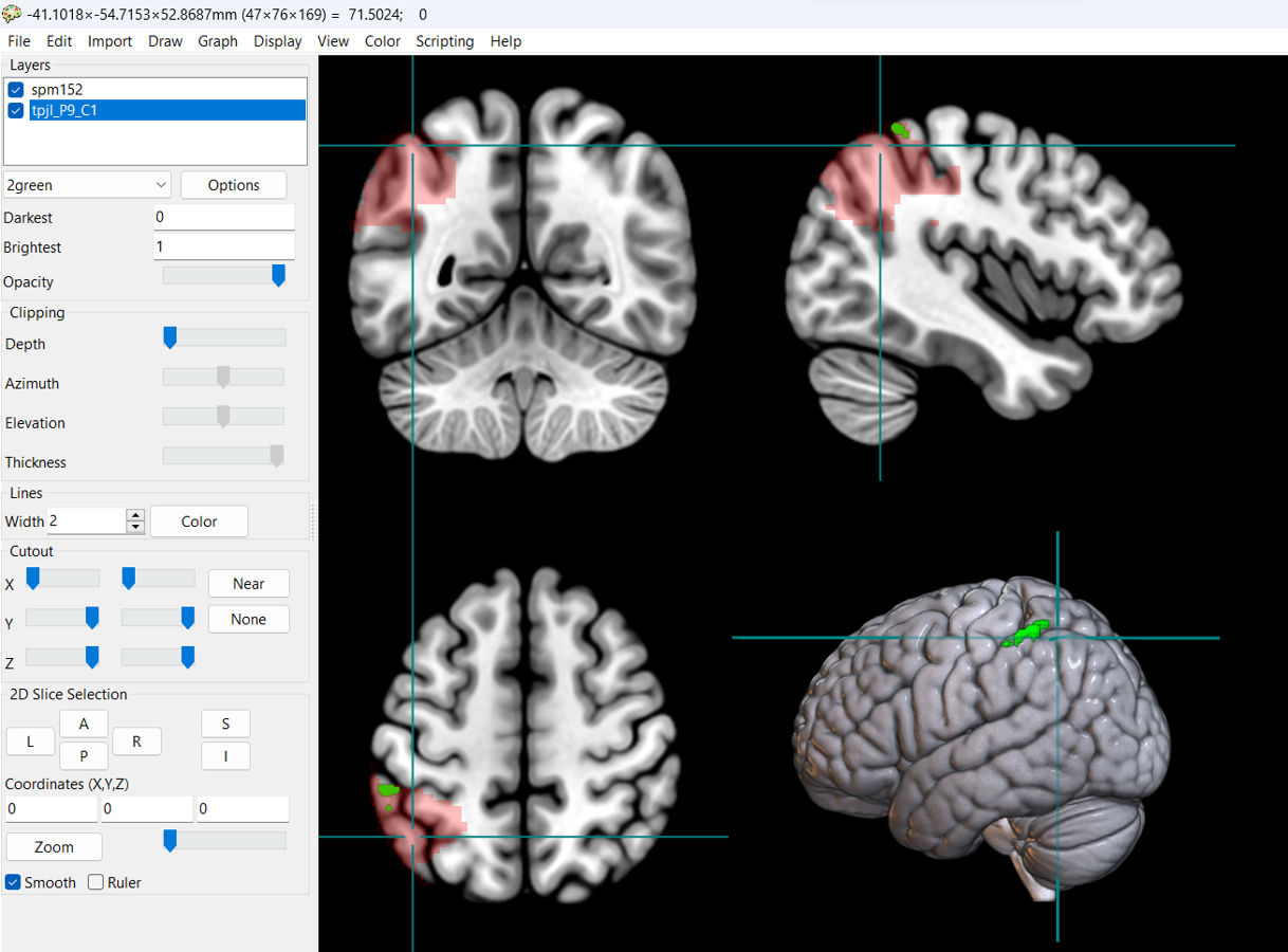 While I can use both of my ROIs as overlays in MRICroGL, my challenge lies in adjusting the transparency of one of them while keeping the other opaque in the render view. Specifically, I'm using these overlays to visualize connectivity results, where one ROI serves as the seed and the other as the target (activation area).