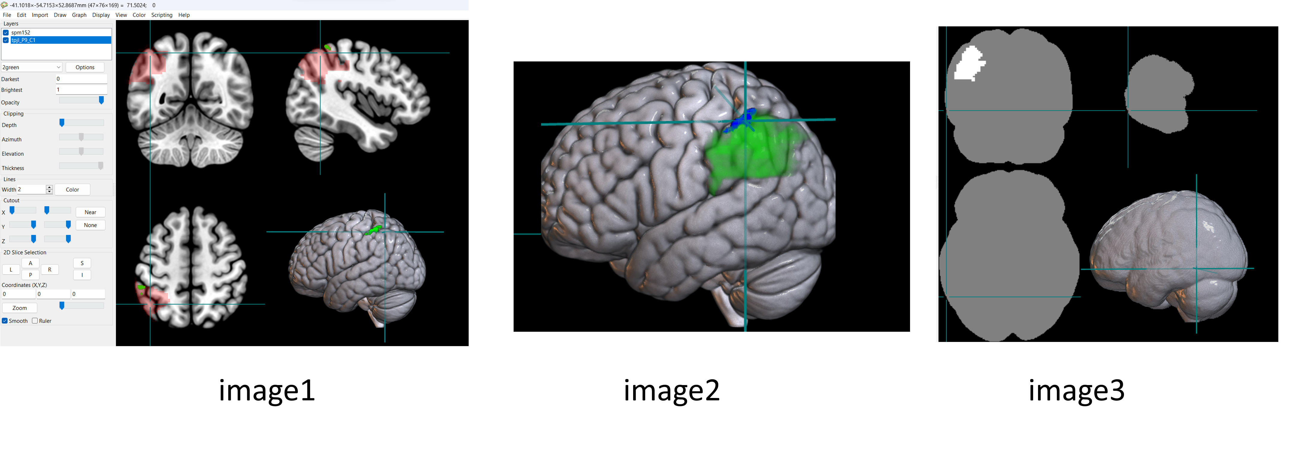 I tried also "draw->advance->create overlap image" option to combine the rendered brain with the seed ROI thinking then to overlay the other ROI (target) on top of them. Unfortunately, this approach distorts the template template, and the colors are not preserved as desired ("image3").