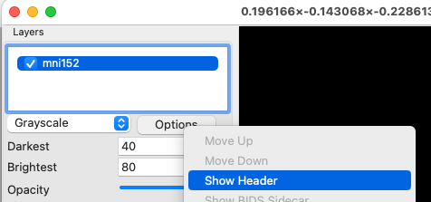 Your screenshot shows the File menu from the Main menu. The main menu provides settings that influence ALL images. Note that MRIcroGL can load multiple images simultaneously that can each have different properties. Therefore, to find details regarding a specific image you must select it in the "Layers" panel and choose image specific options from the "Options" drop down menu in the Layers panel. Note that this drop down menu has an option named "Show header". The image is visibly Asymmetric.